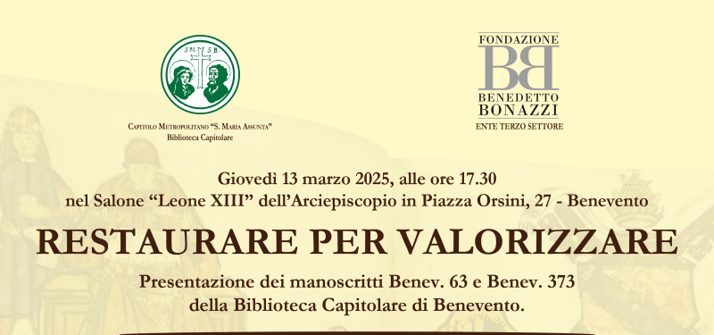 Presentazione dei manoscritti Benev. 63 e Benev. 373 della Biblioteca Capitolare di Benevento», che si svolgerà Giovedì 13 marzo 2025, alle ore 17.30, nel Salone “Leone XIII” dell’Arciepiscopio in Piazza Orsini, 27, Benevento, con il seguente programma: