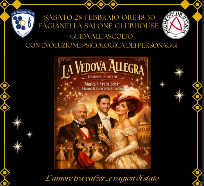 “La Vedova Allegra”, ovvero un’illustrazione dell’opera di Franz Lehàr, compositore austriaco di origine ungherese, con guida all’ascolto con evoluzione psicologica dei personaggi, tramite voci e immagini, è lo spettacolo che si svolgerà sabato sera, 7 marzo 2026, presso il Salone Club House del Circolo “La Fagianella”, con inizio alle ore 18,30.