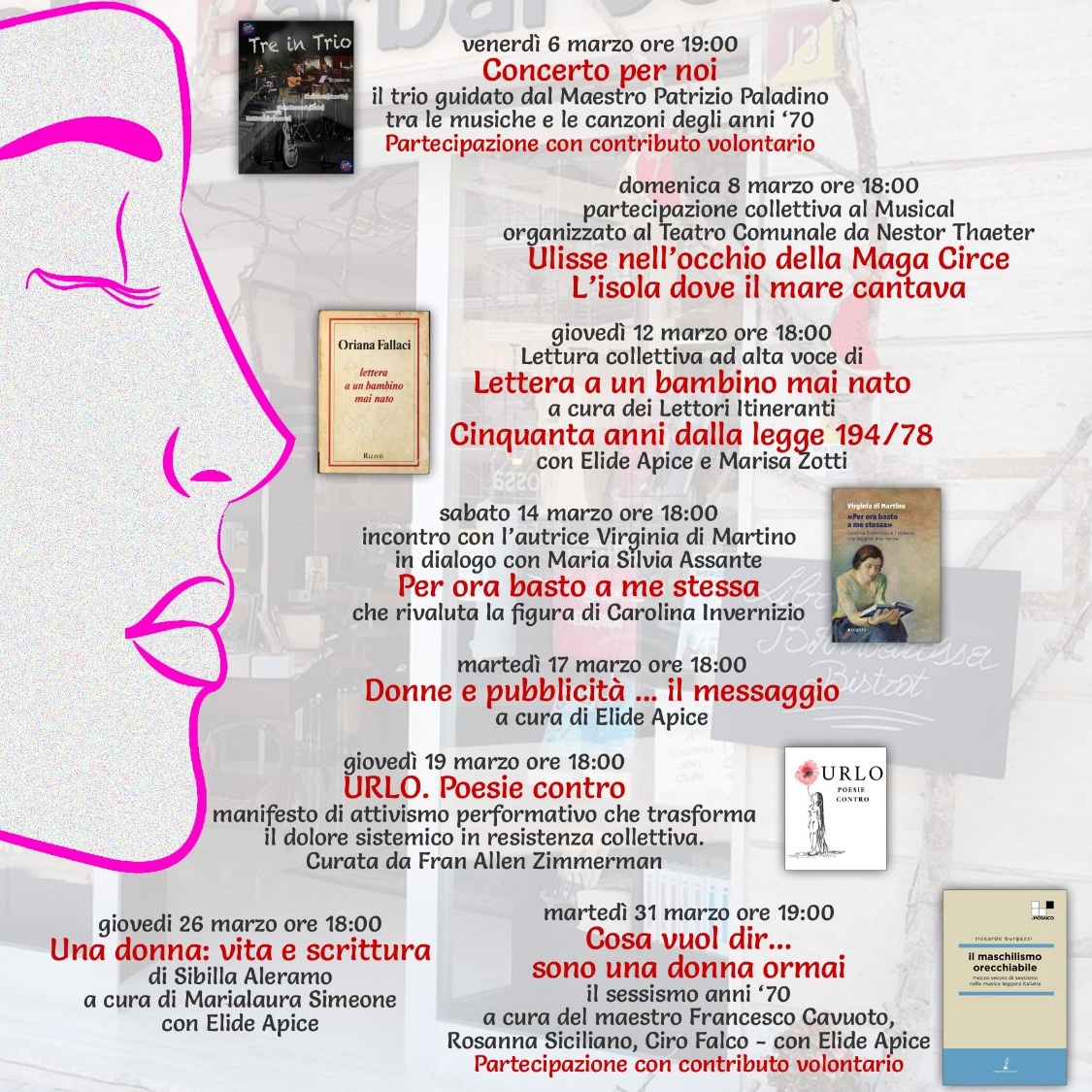 Al via, come consuetudine, “Marzo delle Donne”, la serie di iniziative organizzate da Culture e Letture aps presso la Libreria Barbarossa di Benevento e dedicate per l’intero mese all’universo Femminile. Proveremo ad affrontare diversi temi, dalla violenza di genere, ai canoni femminili letterari dimenticati a cura di Maria Laura Simeone, o a un nuovo sguardo su Carolina Invernizio a cura di Virginia Di Martno in dialogo con Maria Silvia Assante, al maschilismo insito in alcune canzoni a cura di Francesco Cavuoto, Rosanna Siciliano e Ciro Falco, senza dimenticare momenti di apparente leggerezza con serate in musica dedicate al femminile a cura di Claudio Patuto, Giovanni Santamaria e Patrizio Paladino. Si parlerà, inoltre, di Pubblicità e donne, di legge sull’aborto e si avrà una serata dedicata al dissenso con la performance curata da Franz Allen Zimmerman in “Urlo. Poesie contro”. Durante le serate della rassegna sarà allestita una mostra d’arte “Anima, Corpo, Voce” con Antonella Botticelli, Roxana Esposito, Elda Gavelli, Benedetta Iandolo, Angela Lapadula, Rosa Manfredonia, Angela Marotti, Pasquale Mastrogiacomo, Ivanna Melfi, Giovanni Orlacchio, Maria Antonietta Palmieri, Sandro Pontillo, Antonella Prosperi, Sabina Russo, Valentina Sepe, Assunta Tammaro, Giuseppe Zotti. Di seguito il cartellone completo degli eventi 6 marzo, ore 18:30, con “Concerto per noi”del trio guidato dal Maestro Patrizio Paladino che ci accompagnerà tra le musiche e le canzoni degli anni ‘70; Il 7 marzo, ore 18:00, partecipazione collettiva alla serata di Balletto organizzata al Teatro Comunale da Nestor Theater dal titolo “Ulisse nell’occhio della Maga Circe – L’isola dove il mare cantava” il 14 marzo, ore 18:00, incontro con l’autrice Virginia di Martino in dialogo con Maria Silvia Assante per il libro “Per ora basto a me stessa” che rivaluta la figura di Carolina Invernizio; il 17 marzo, ore 18:00 “Donne e pubblicità”, come le pubblicità hanno influenzato il ruolo delle donne, con Elide Apice il 19 marzo, ore 18- URLO- POESIE CONTRO, manifesto di attivismo performativo che trasforma il dolore sistemico in resistenza collettiva. Curata da Fran Allen Zimmerman il 20 marzo, ore 18, Lettura collettiva ad alta voce di “Lettera a un bambino mai nato” nel cinquantesimo anno dalla prima pubblicazione, a cura dei Lettori Itineranti;“La legge 194/78” con Elide Apice e Marisa Zotti; il 28 marzo ore 18:00,“Una donna: vita e scrittura di Sibilla Aleramo” a cura di Marialaura Simeone con Elide Apice; il 31 marzo viaggio in musica per “Il maschilismo orecchiabile”, tra il sessismo delle canzoni anni ‘70 , a cura del maestro Francesco Cavuoto, Rosanna Siciliano e Ciro Falco.